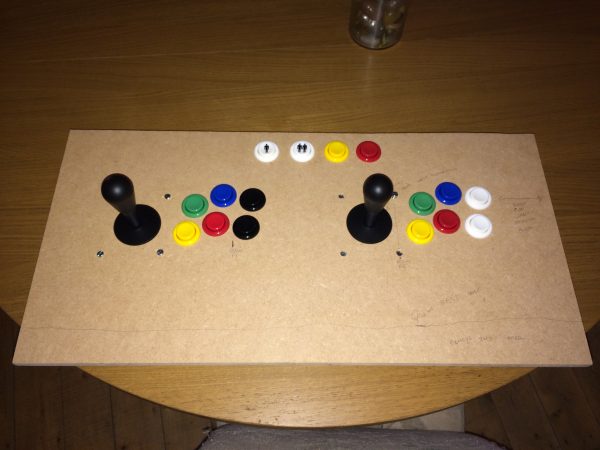 The joystick placement I got from a site rather wonderfully called slagcoin which has some really good write ups on joystick placements. I went with SNES button colours for the first 4 as a visual reminder of that layout. Buttons, sticks and connect bits can be bought from Arcade World. They feel great. Like the real thing. I also used those guys to buy the vinyl corner thing that wraps the edges for that extra arcade feel.