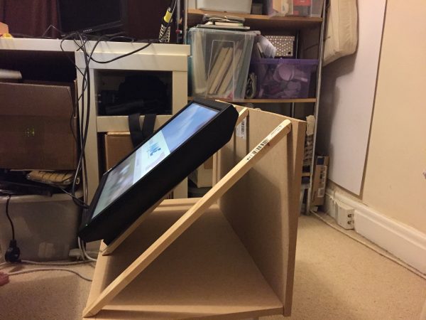 My serendipitous moment came when, whilst in an early stage of prototyping, I discovered that the 4:3 monitor I had ordered didn’t come with the worlds greatest viewing angle. High glare was visible when the screen was viewed flat from above at the angle you would play at on a tabletop style coffee table. So I accepted this as a limitation to work around. My solution was the mount the screen at a 45 degree angle.