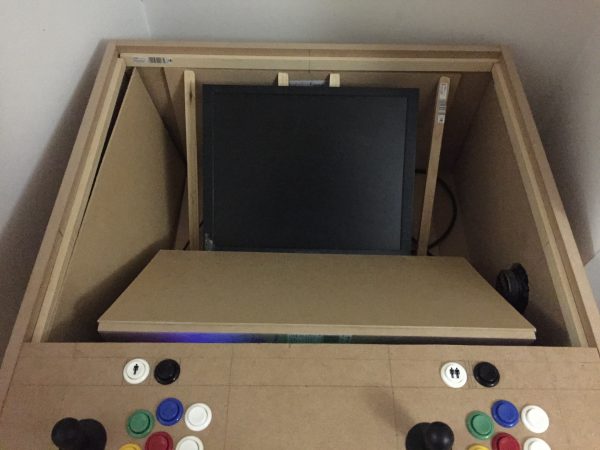 The front compartment flips up and reveals the inner workings of the arcade coffee table. Most of this is in good shape, it’s all painted, last jobs are to hide the electronics. When I’ve updated that I’ll update this with some images.